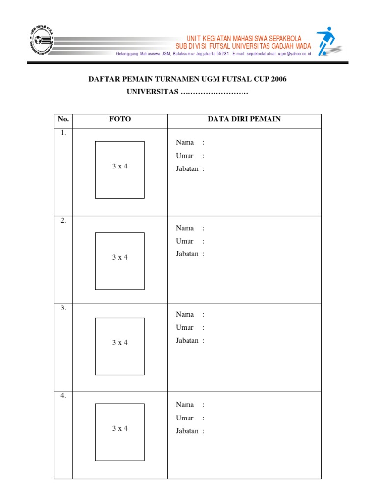 Borang pendaftaran karnival bolasepak kelab bolasepak kota damansara facebook. Contoh format daftar pemain sepak bola. Contoh susunan panitia dalam proposal Sekolah sepak bola ssb persaja bekasi susunan pengurus. Daftar pemain turnamen ugm futsal cup 2006 universitas ……………………… no.
